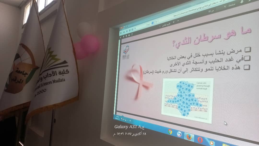 اختتمت اليوم بمدرج كلية الآداب والعلوم مسلاته فعاليات الفريق التوعوي لمكافحة أمراض السرطان مسلاته، وكان اقبال وحضور متميز من الفئات المستهدفة. تحت إشراف مكتب البحوث والاستشارات وبرعاية قسم التربية وعلم النفس بالكلية.