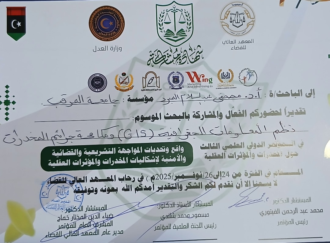 مشاركة أ.د مصطفى عبدالسلام المبرد باسم قسم الجغرافيا كلية الآداب والعلوم مسلاتة - جامعة المرقب في المؤتمر العلمي الثالث حول المخدرات والمؤثرات العقلية بورقة بحثية بعنوان: نظم المعلومات الجغرافية(GIS) ومكافحة جرائم المخدرات، ومن خلال دراسة معدلاتها واتجاهاتها وتحديد نقاطها الساخنة، نلاحظ أن الوضع كارثي بمعنى الكلمة، فمعدل هذه الجرائم مرتفع جداً، والكميات المضبوطة تفوق التوقع، وعدد المدمنين في تزايد مستمر بمتوالية هندسية، وهذا ما يصل الى علم السلطات فقط ،ونرى ان الرقم الصحيح اكبر من ذلك بكثير، لان اغلب جرائم المخدرات لا يتم ضبطها.