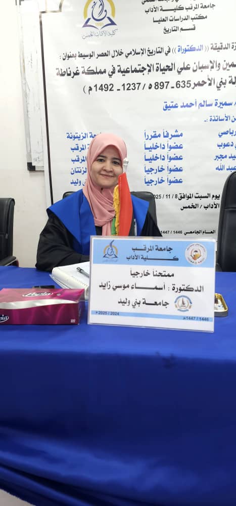 أجازت لجنة المُناقشة بقسم التاريخ بكلية الآداب - الخمس صباح يوم السبت الموافق 8-11-2025م أطروحة دكتوراه في التاريخ المُقدمة من الباحثة بالقسم: «سميرة سالم أحمد عتيق»