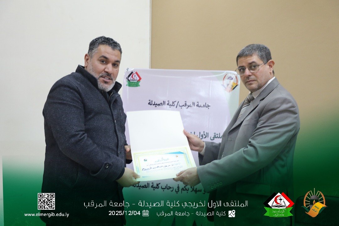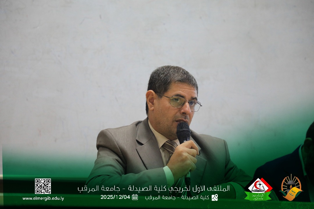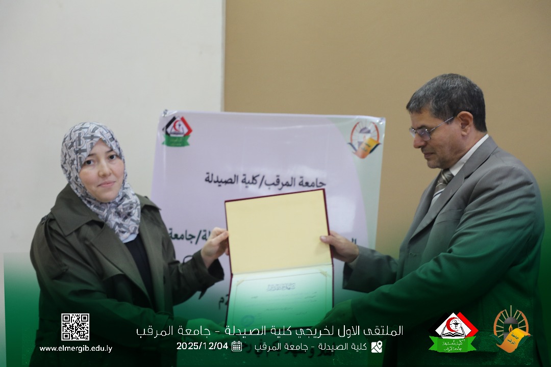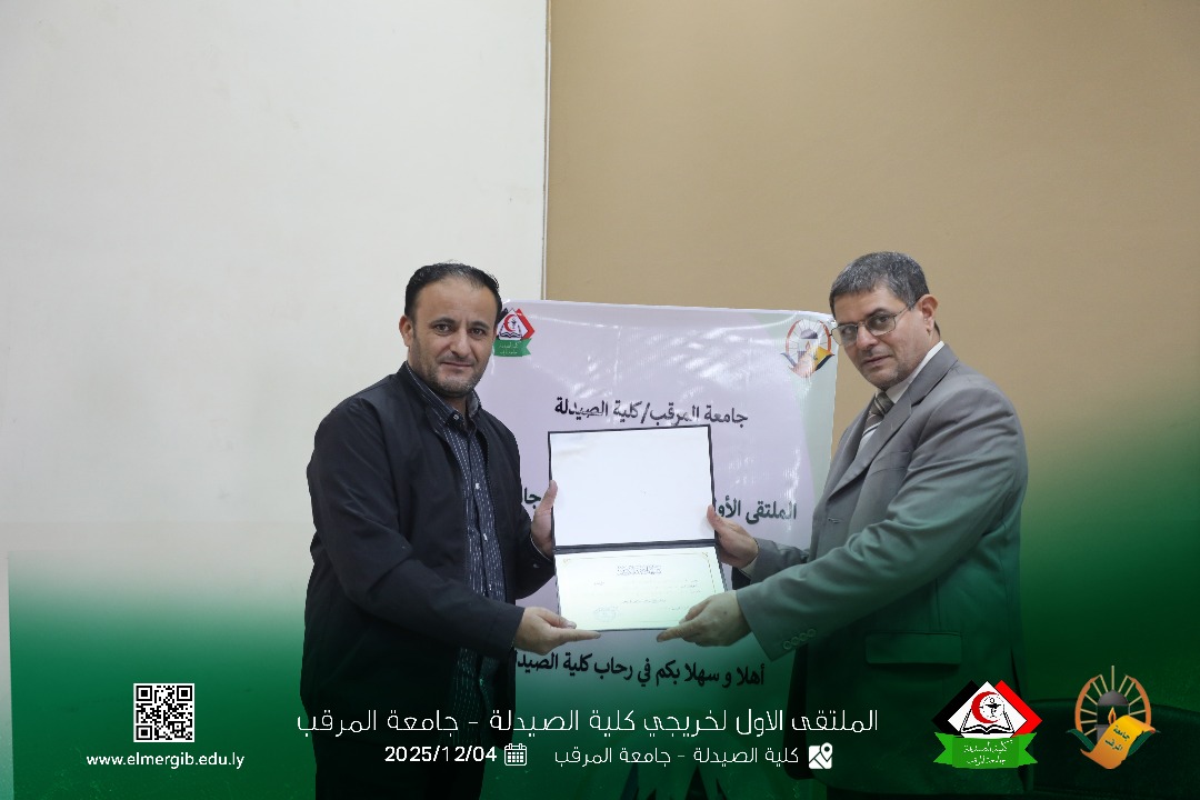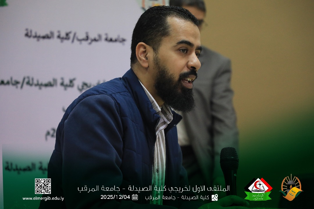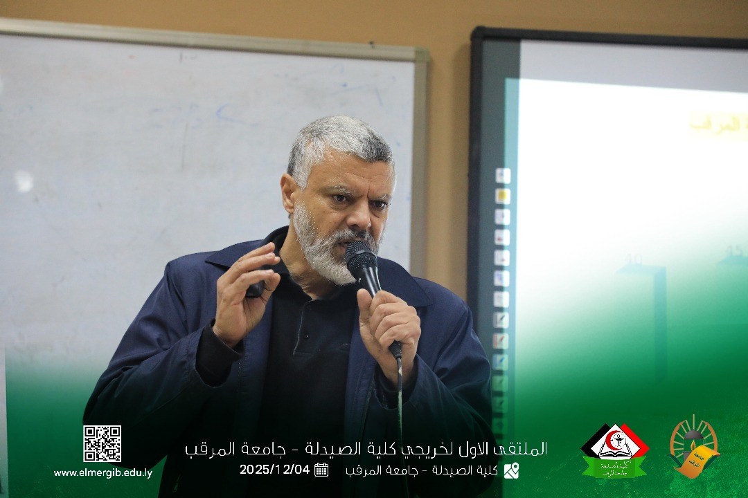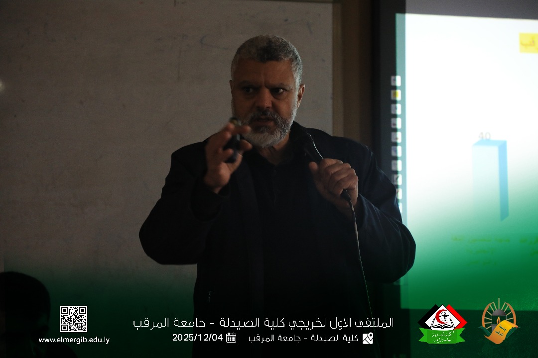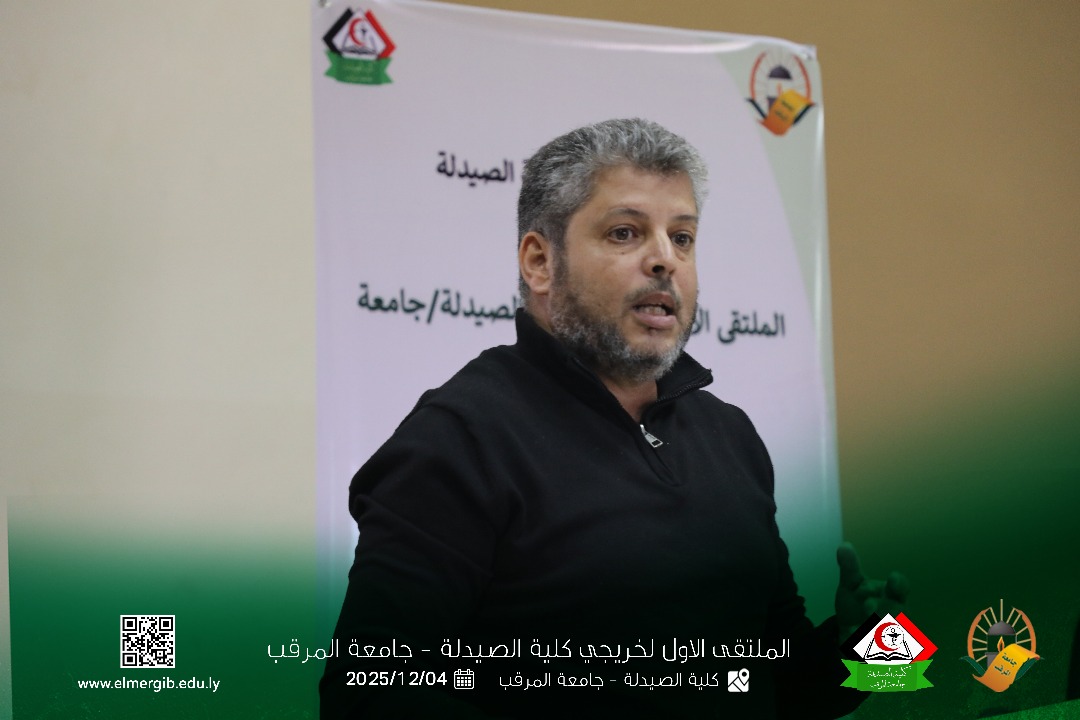 تحت شعار (معا نحو تطوير المهنة وبناء جسور التواصل) أقيم بمدرج كلية الصيدلة جامعة المرقب المتلقي الاول لخريجي الكلية يوم الخميس 2025.12.4م حيث شهد حضور لفيف من خريجي الكلية وعدد من اعضاء هيئة التدريس والموظفين بالكلية وبعض الضيوف الكرام