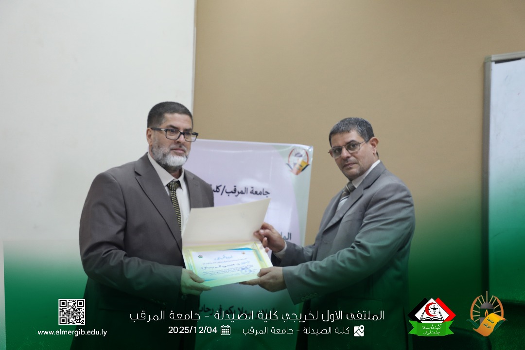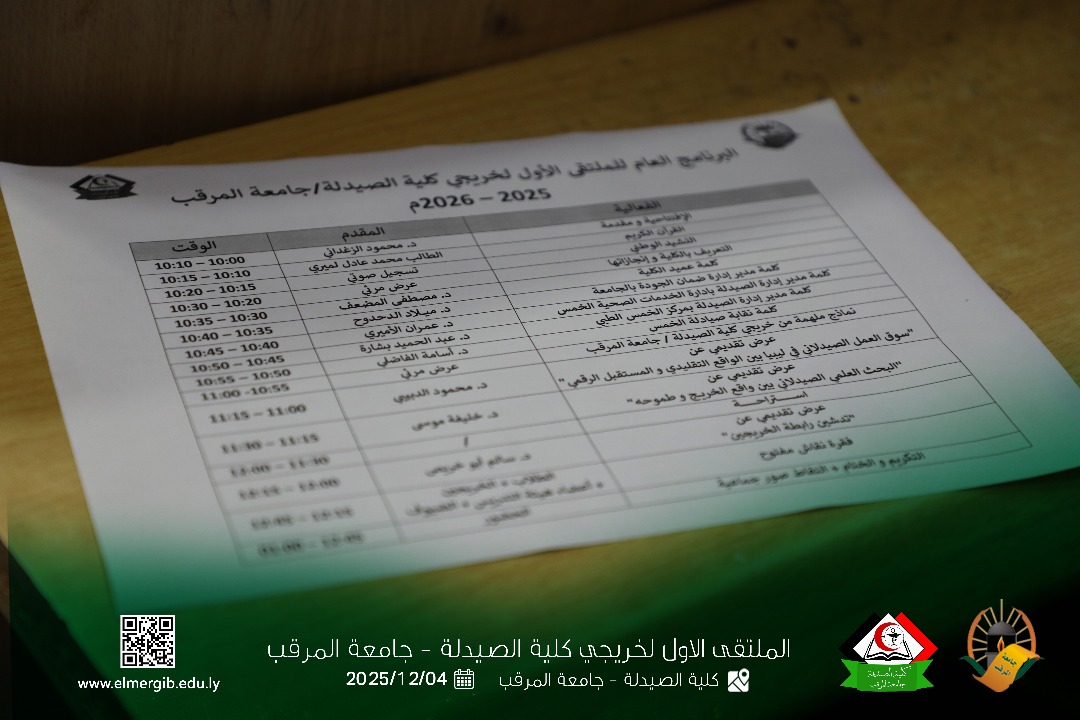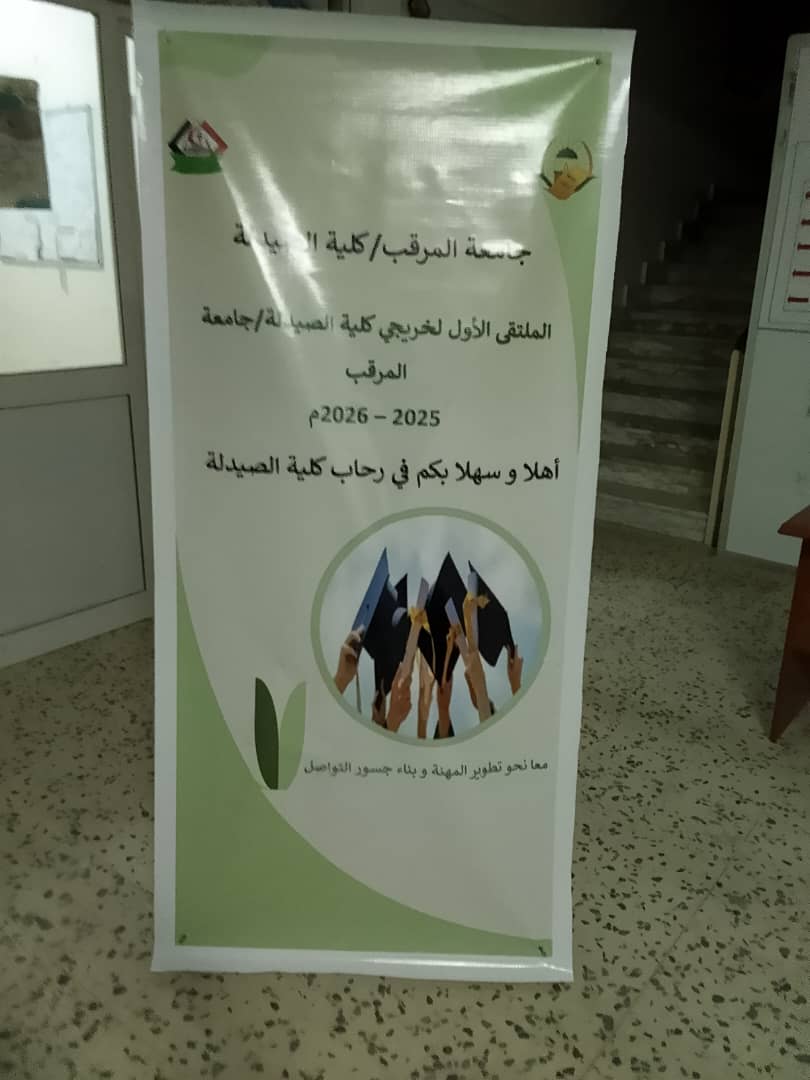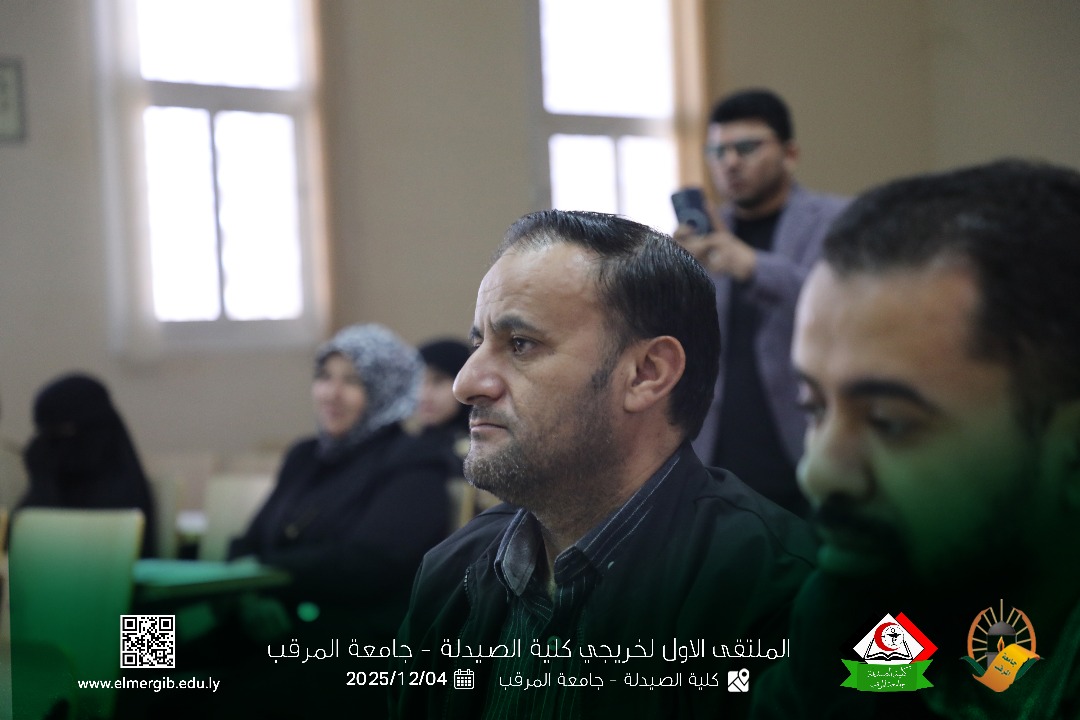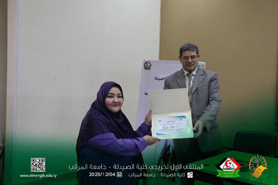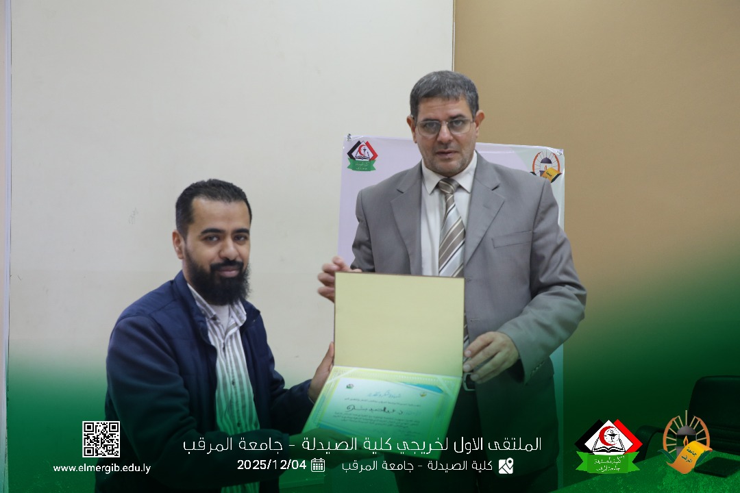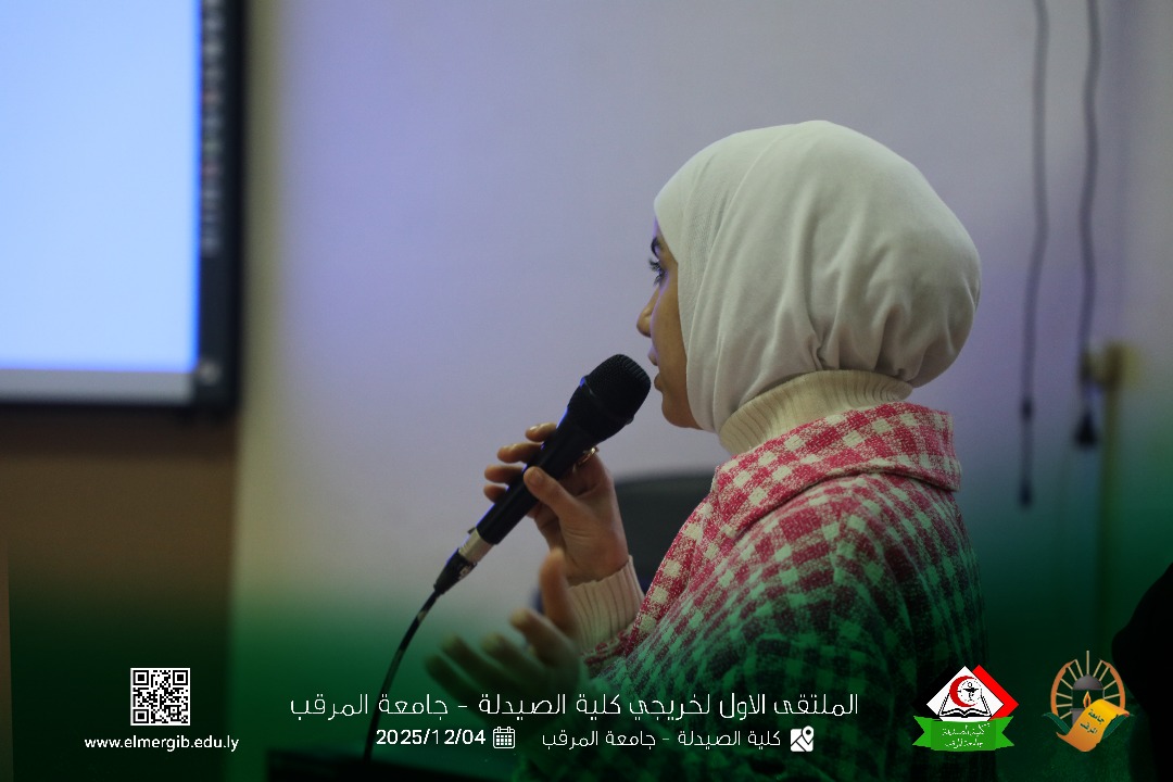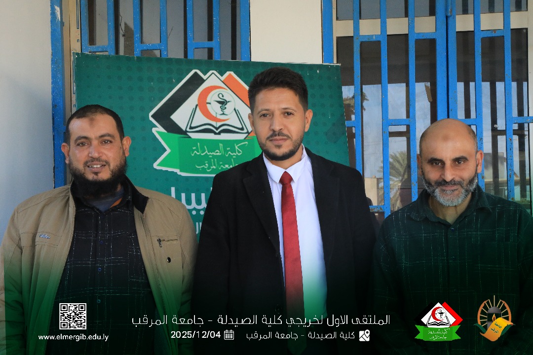 تحت شعار (معا نحو تطوير المهنة وبناء جسور التواصل) أقيم بمدرج كلية الصيدلة جامعة المرقب المتلقي الاول لخريجي الكلية يوم الخميس 2025.12.4م حيث شهد حضور لفيف من خريجي الكلية وعدد من اعضاء هيئة التدريس والموظفين بالكلية وبعض الضيوف الكرام