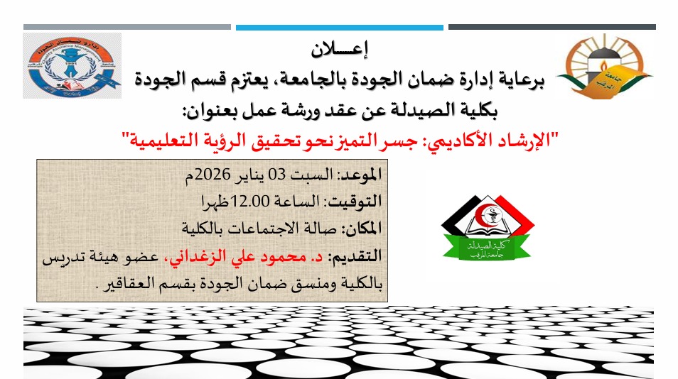انطلاقا من دورنا في بناء تجربة تعليمية متكاملة، تعقد هذه الورشة لتسليط الضوء على اهمية الارشاد الاكاديمي بوصفه عاملا حاسما في نجاح المسيرة التعليمية للطالب وجودة المخرجات الاكاديمية.