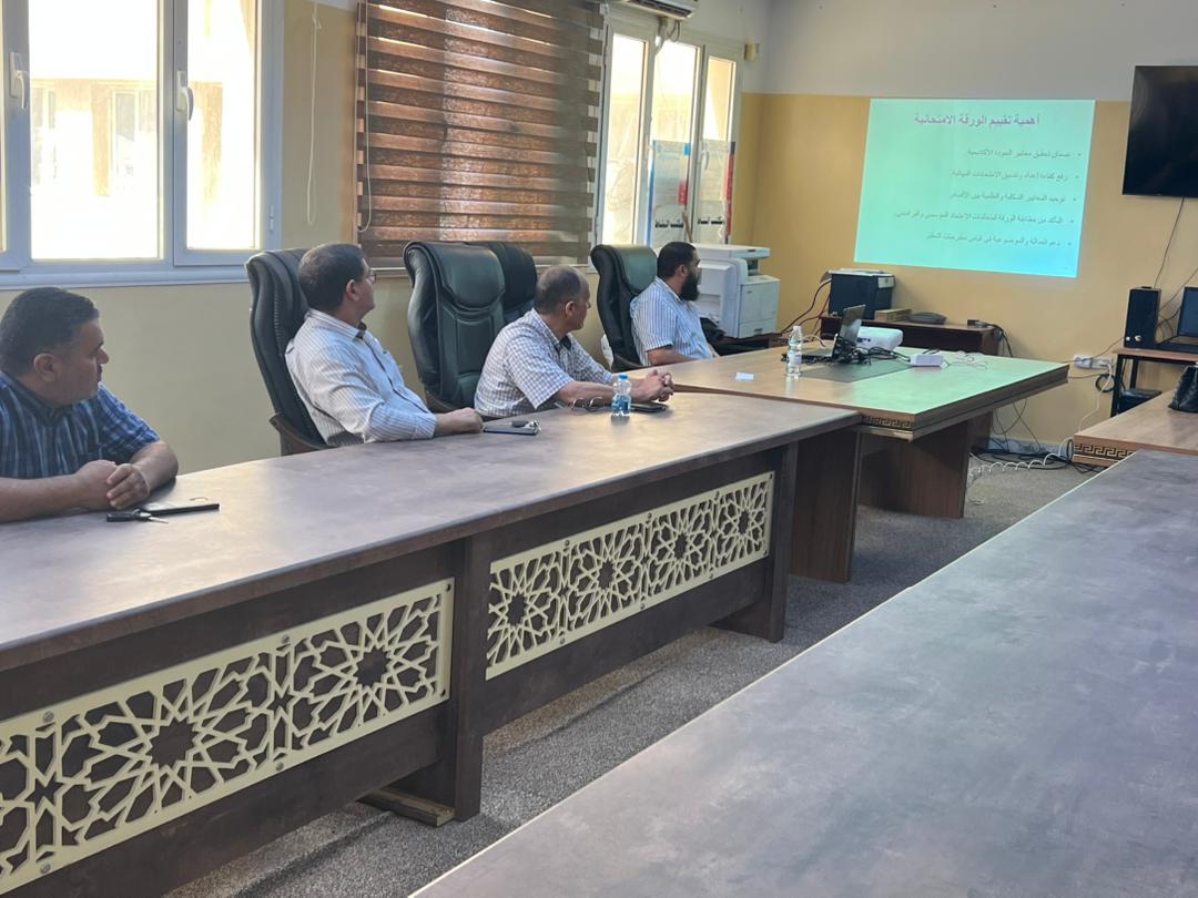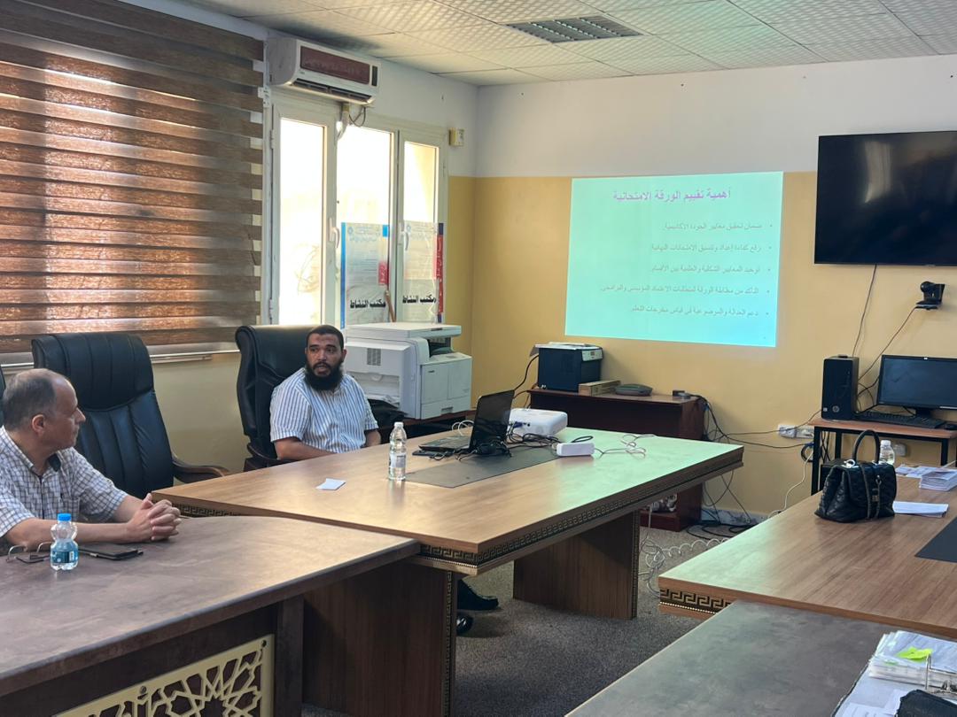 قدّم الورشة الدكتور عبد العزيز سويدان، حيث تناول خلالها الأسس والمعايير العلمية لإعداد الورقة الامتحانية المتكاملة التي تتضمن جميع المعلومات التي يحتاجها الطالب، بما يحقق العدالة والموضوعية في التقييم، ويعكس مخرجات التعلم المستهدفة للمقررات الدراسية.