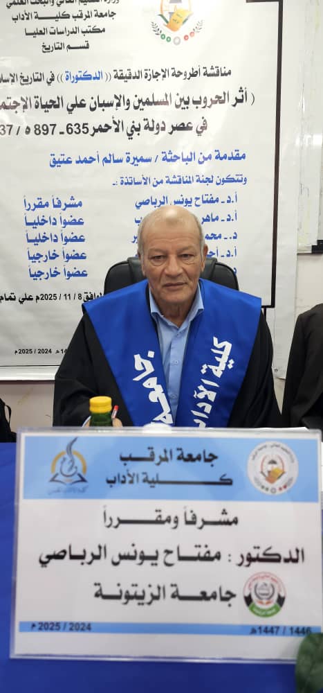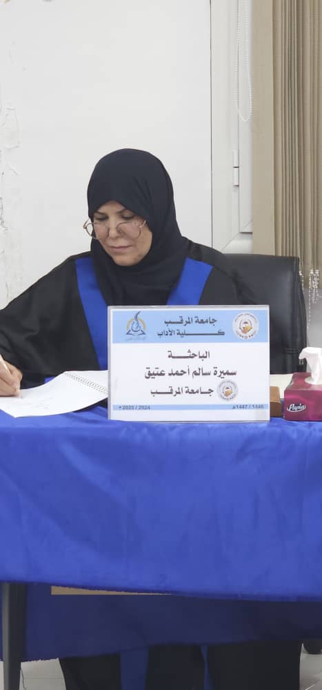 أجازت لجنة المُناقشة بقسم التاريخ بكلية الآداب - الخمس صباح يوم السبت الموافق 8-11-2025م أطروحة دكتوراه في التاريخ المُقدمة من الباحثة بالقسم: «سميرة سالم أحمد عتيق»