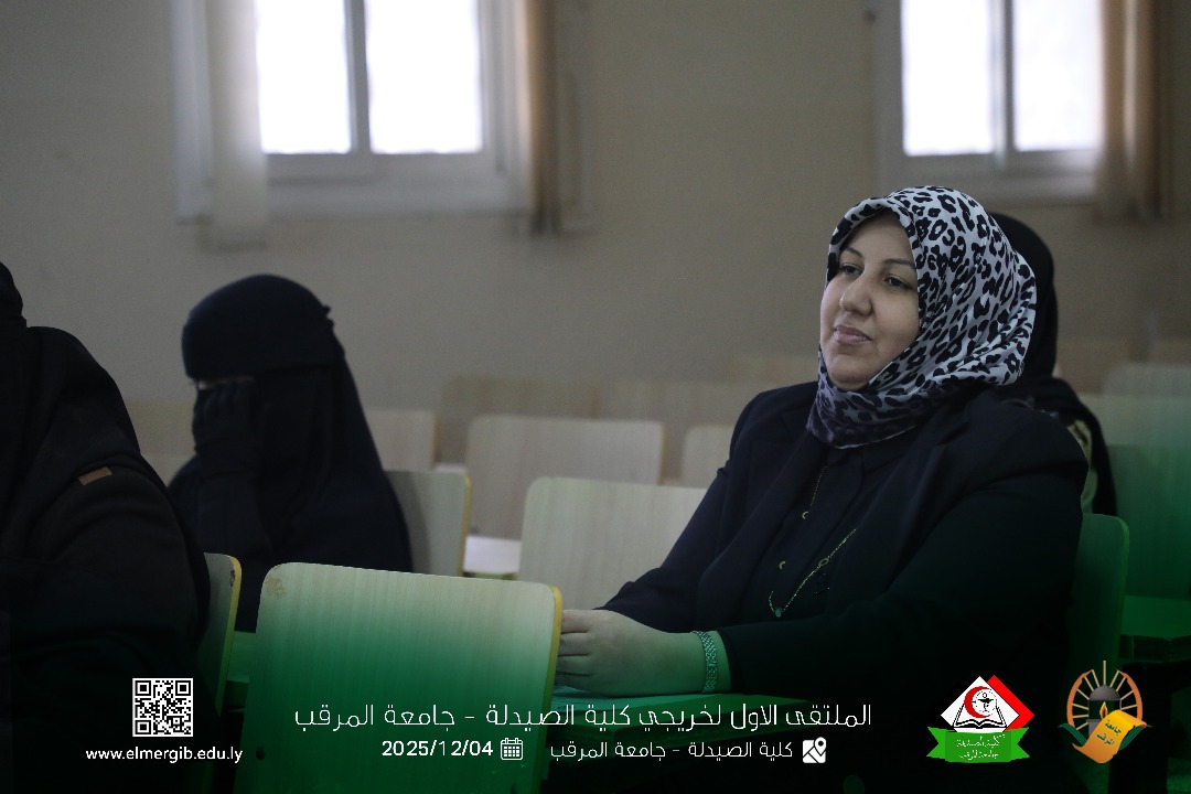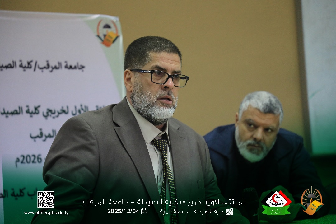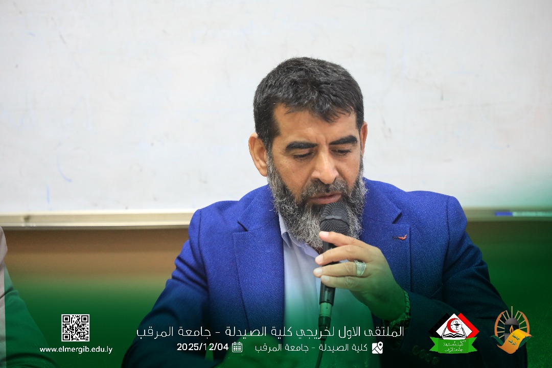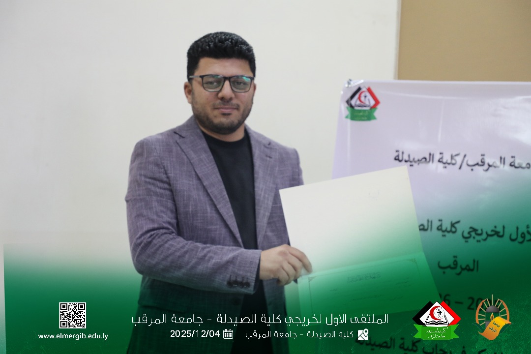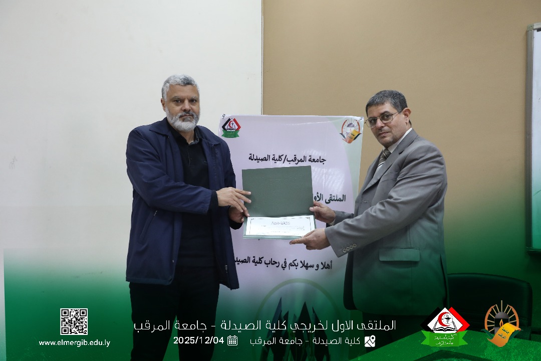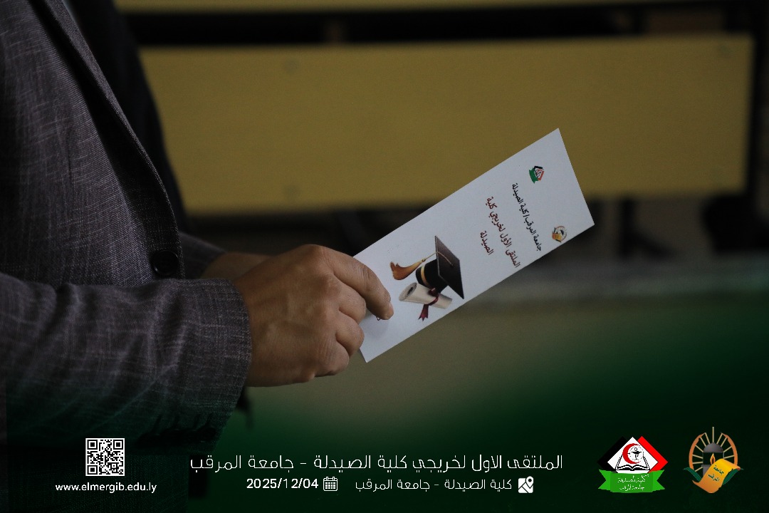 تحت شعار (معا نحو تطوير المهنة وبناء جسور التواصل) أقيم بمدرج كلية الصيدلة جامعة المرقب المتلقي الاول لخريجي الكلية يوم الخميس 2025.12.4م حيث شهد حضور لفيف من خريجي الكلية وعدد من اعضاء هيئة التدريس والموظفين بالكلية وبعض الضيوف الكرام